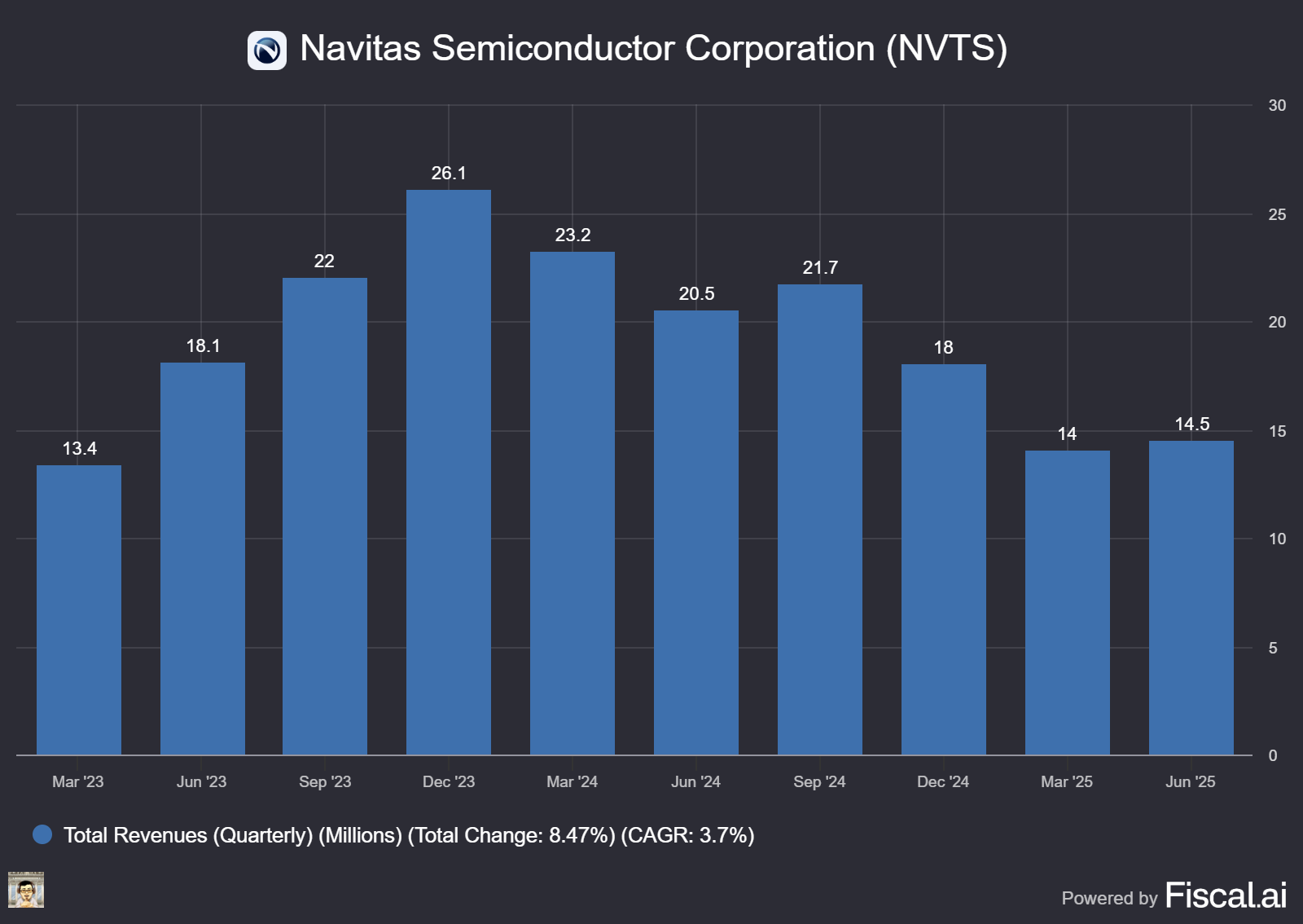 💰 Revenue $14.5 million (mid‑guidance) amid a classic semi downturn; solar, EV and industrial demand remain soft.