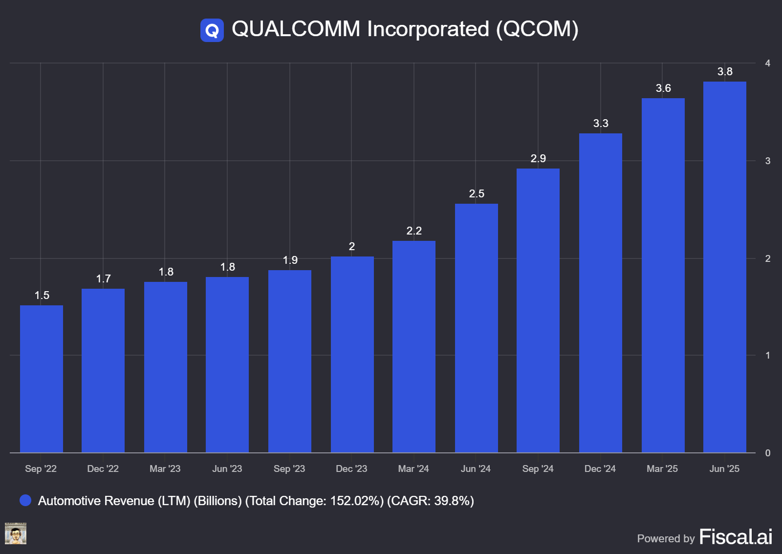 🚘 Auto ahead of plan, high visibility: “We’ll beat ‘26 target,” Palkhiwala said, adding Qualcomm remains on track for $8B Auto revenue in FY29 (~20% CAGR) and that “greater than 80%” of cumulative auto revenue for the next four years is backed by existing design wins. Qualcomm participates in the fast-growing slices of the car—connectivity, digital cockpit, and ADAS—with management estimating that SAM grows ~15% even if auto units stay flat.